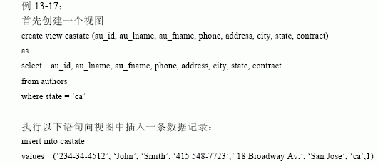 注意:由于向視圖插入數據實質是向其所引用的基本表中插入數據,所以必須確認那些來包括在視圖列但屬于表的列允許null值或有缺省值。