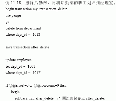 注意:如果不指定回滾的事務名稱或保存點,則rollback transaction命令會將事務回滾到事務執行前,如果事務是嵌套的、則會回滾到最靠近的begin transaction命令前。