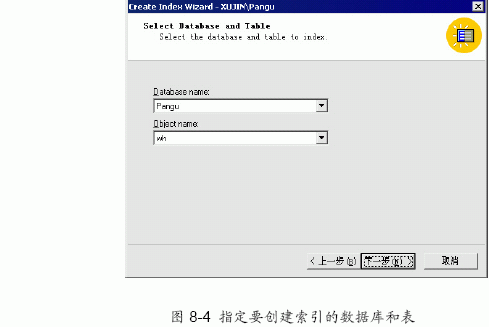 選擇要創建索引的表,單擊右鍵,從快捷菜單中選擇“所有任務(all tasks)”子菜單中的“manage indexes”選項,將會出現如圖8-9 所示的索引管理對話框,其中列出了表中已經存在的索引。選擇“new” 按鈕,進入如圖8-10 所示的創建索引對話框。在圖8-10中,輸入要創建的索引的名稱,再選擇用于創建索引的列,并設置索引的各種選項(有關索引選項的設置,請參考前面講述的create index 命令)。單擊“ok” 按鈕,完成索引的創建。