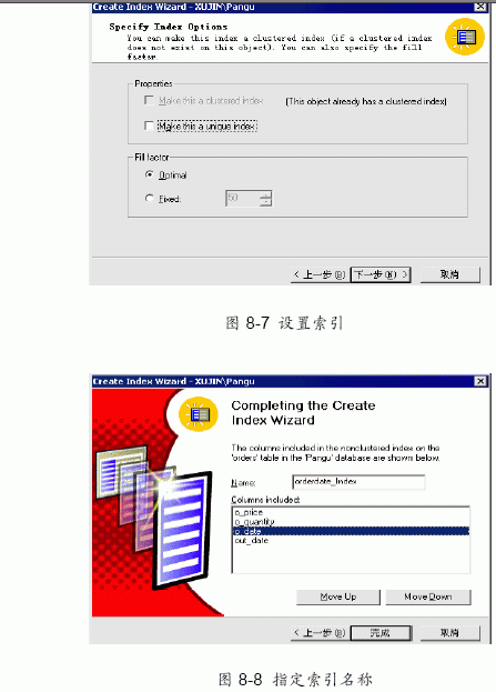 (7) 單擊“下一步”按鈕,出現如圖8-8 所示的完成索引創建界面,在此可以指定所創建索引的名稱,還可以調整組成索引的列的順序。單擊“完成”按鈕,結束索引創建過程。系統會彈出一個創建索引成功信息對話框。