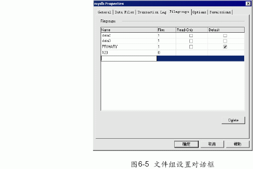 在“filegroups” 頁框中,如圖6-5 所示,可以添加或刪除文件組,不過,如果文件組中有文件則不能刪除,必須先將文件移出文件組。