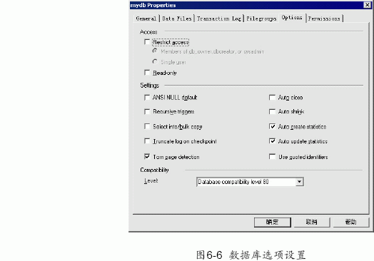 在options 選項頁框中,可以設置數據庫的許多屬性,如圖6-6 所示。在圖6-6 中選中的選項都是系統默認為true 的。