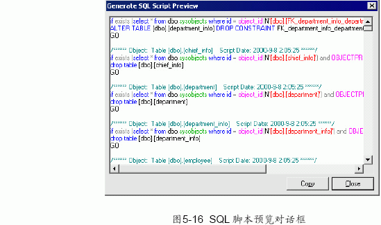 (2) 在sql 腳本生成對話框中設置選項后,單擊“preview” 按鈕即會彈出如圖5-16 所示的預覽對話框。可以點擊“copy” 按鈕,即可將腳本語句復制到剪貼板中。也可在圖5-15 中選擇“確定”按鈕,指定腳本文件名和存放位置。