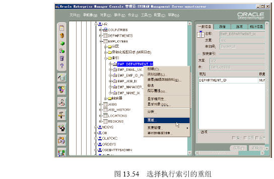 (1)以【登錄到管理服務器】方式來登錄【企業管理器】,在【管理目標導航器】中選擇【網絡】/【數據庫】/【myoracle.mynet】/【方案】/【表】/【hr】/【employees】/【索引】/【em_department_ix】選項,單擊鼠標右鍵,在彈出的快捷菜單里選擇【重組】選項,如圖13.54所示。