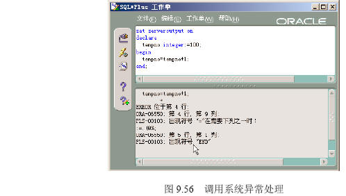 下列代碼為錯誤代碼,在【sqlplus worksheet】中的執行結果如圖9.56所示。