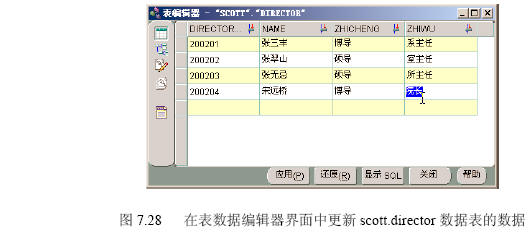 (1)圖7.28所示為數(shù)據(jù)表編輯器界面。在表格中直接將“director_id”為“200204”的導(dǎo)師的“zhiwu”由“系副主任”更改為“院長(zhǎng)”。