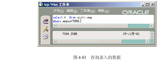 (3)在【命令編輯區】輸入“select * from scott.emp where empno=7999;”,然后單擊【執行】按鈕,出現如圖4.43所示的結果。