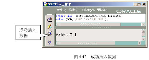 (2)在【命令編輯區】輸入“insert into scott.emp(empno, ename, hiredate) values (7999, ’jone’,’25-11月-2002’);”,然后單擊【執行】按鈕,出現如圖4.42所示的結果。