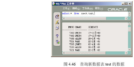 (2)在【命令編輯區】輸入“select * from scott.test;”語句,然后單擊【執行】按鈕,出現如圖4.46所示的結果。