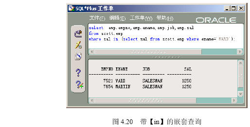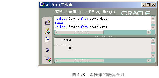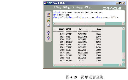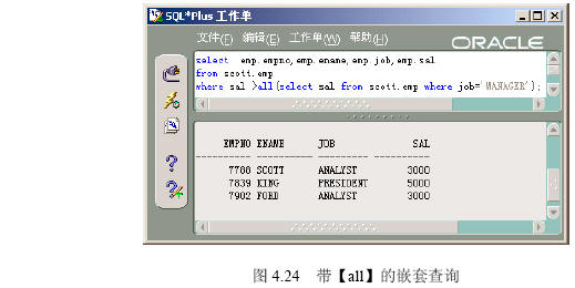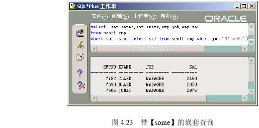 在select查詢語句里可以嵌入select查詢語句,稱為嵌套查詢。有些書上將內嵌的select語句稱為子查詢,子查詢形成的結果又成為父查詢的條件。 子查詢可以嵌套多層,子查詢操作的數據表可以是父查詢不操作的數據表。子查詢中不能有order by分組語句。 4.4.1 簡單嵌套查詢 在【命令編輯區】執行下列語句。 ――――――――――――――――――――――――――――――――――――― select emp.empno,emp.ename,emp.job,emp.sal from scott.emp where sal>=(select sal from scott.emp where ename='ward'); ――――――――――――――――――――――――――――――――――――― 單擊【執行】按鈕,出現如圖4.19所示的結果。 【參見光盤文件】:/第4章/4.4/441.sql。 在這段代碼中,子查詢select sal from scott.emp where ename='ward'的含義是從emp數據表中查詢姓名為ward的員工的薪水,父查詢的含義是要找出emp數據表中薪水大于等于ward的薪水的員工。上面的查詢過程等價于兩步的執行過程。 (1)執行“select sal from scott.emp where ename='ward'”,得出sal=1250; (2)執行“select emp.empno,emp.ename,emp.job,emp.sal from scott.emp where sal>=1250;” 4.4.2 帶【in】的嵌套查詢 在【命令編輯區】執行下列語句。 ――――――――――――――――――――――――――――――――――――― select emp.empno,emp.ename,emp.job,emp.sal from scott.emp where sal in (select sal from scott.emp where ename='ward'); ――――――――――――――――――――――――――――――――――――― 單擊【執行】按鈕,出現如圖4.20所示的結果。 【參見光盤文件】:/第4章/4.4/442.sql。 上述語句完成的是查詢薪水和ward相等的員工,也可以使用【not in】來進行查詢。 4.4.3 帶【any】的嵌套查詢 在【命令編輯區】執行下列語句。 ――――――――――――――――――――――――――――――――――――― select emp.empno,emp.ename,emp.job,emp.sal from scott.emp where sal >any(select sal from scott.emp where job='manager'); ――――――――――――――――――――――――――――――――――――― 單擊【執行】按鈕,出現如圖4.21所示的結果。 【參見光盤文件】:/第4章/4.4/443.sql。 帶any的查詢過程等價于兩步的執行過程。 (1)執行“select sal from scott.emp where job='manager'”,其結果如圖4.22所示。 【參見光盤文件】:/第4章/4.4/443-1.sql。 (2)查詢到3個薪水值2975、2850和2450,父查詢執行下列語句。 【參見光盤文件】:/第4章/4.4/443-2.sql。 ―――――――――――――――――――――――――――――――――――――― select emp.empno,emp.ename,emp.job,emp.sal from scott.emp where sal >2975 or sal>2850 or sal>2450; ―――――――――――――――――――――――――――――――――――――― 4.4.4 帶【some】的嵌套查詢 在【命令編輯區】執行下列語句。 ――――――――――――――――――――――――――――――――――――― select emp.empno,emp.ename,emp.job,emp.sal from scott.emp where sal =some(select sal from scott.emp where job='manager'); ――――――――――――――――――――――――――――――――――――― 單擊【執行】按鈕,出現如圖4.23所示的結果。 【參見光盤文件】:/第4章/4.4/444.sql。 帶some的嵌套查詢與any的步驟相同。 (1)子查詢,執行“select sal from scott.emp where job='manager'”,其結果如圖4.22所示。 (2)父查詢執行下列語句。 ――――――――――――――――――――――――――――――――――――― select emp.empno,emp.ename,emp.job,emp.sal from scott.emp where sal =2975 or sal=2850 or sal=2450; ――――――――――――――――――――――――――――――――――――― 【參見光盤文件】:/第4章/4.4/444-2.sql。 帶【any】的嵌套查詢和【some】的嵌套查詢功能是一樣的。早期的sql僅僅允許使用【any】,后來的版本為了和英語的【any】相區分,引入了【some】,同時還保留了【any】關鍵詞。 4.4.5 帶【all】的嵌套查詢 在【命令編輯區】執行下列語句。 ――――――――――――――――――――――――――――――――――――― select emp.empno,emp.ename,emp.job,emp.sal from scott.emp where sal >all(select sal from scott.emp where job='manager'); ――――――――――――――――――――――――――――――――――――― 單擊【執行】按鈕,出現如圖4.24所示的結果。 【參見光盤文件】:/第4章/4.4/445.sql。 帶all的嵌套查詢與【some】的步驟相同。 (1)子查詢,結果如圖4.22所示。 (2)父查詢執行下列語句。 ――――――――――――――――――――――――――――――――――――― select emp.empno,emp.ename,emp.job,emp.sal from scott.emp where sal >2975 and sal>2850 and sal>2450; ――――――――――――――――――――――――――――――――――――― 【參見光盤文件】:/第4章/4.4/445-2.sql。 4.4.6 帶【exists】的嵌套查詢 在【命令編輯區】執行下列語句。 ――――――――――――――――――――――――――――――――――――― select emp.empno,emp.ename,emp.job,emp.sal from scott.emp,scott.dept where exists (select * from scott.emp where scott.emp.deptno=scott.dept.deptno); ――――――――――――――――――――――――――――――――――――― 單擊【執行】按鈕,出現如圖4.25所示的結果。 【參見光