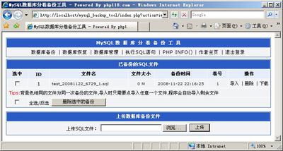 下面推薦的一款”php版mysql數據庫分卷備份工具”,可以輕松勝任超大數據庫的備份/導入工具,最重要的是,他可以分卷操作,并可以指定每個文件的大小。