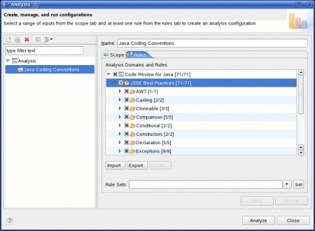 要對代碼進行靜態分析,需要創建分析配置。在java視圖或analysis圖標中,使用上下文菜單打開analysis窗口,它現在應該出現在工具欄上(參見圖9)。分析配置決定了要分析的代碼(scope)和應該遵循的規則(rules)。有71條規則可供選擇,例如"avoid casting primitive types to lower precision"和"always provide a break at the end of every case statement"。您還可以使用預定義的規則,例如"java quick code review"(在這里,71條規則中只有19條適用)。