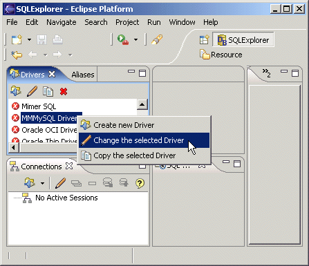drivers 標簽顯示了不同的數據庫驅動,它們被用來連接不同的數據庫。現在可用的數據庫包括db2, mysql, oracle, sybase, hsqldb, sqlserver 和 postgresql。針對mysql,我們需要配置sqlexplorer。為了配置mysql驅動,右擊 mmmysql driver 結點, 并且選擇 change the selected driver, 如圖4所示。