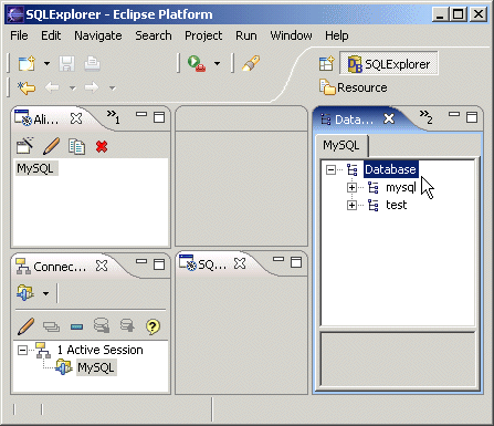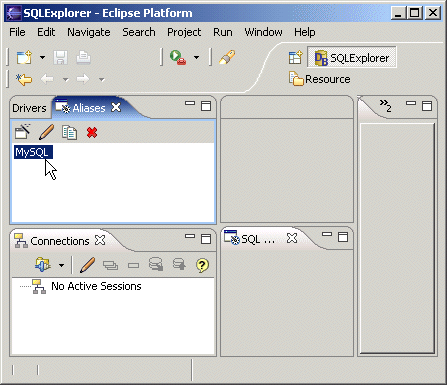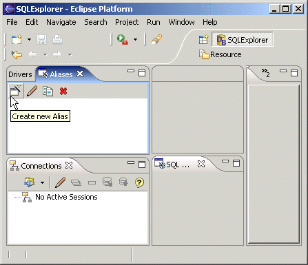 想要連接到 mysql 數據庫并提取其中的表格,我們需要為連接建立一個別名。一個連接的別名說明了連接設置,jdbc 驅動,url,用戶名和密碼。在sqlexplorer視窗中選擇 aliases 標簽。單擊 “create new alias” 按扭來創建一個新的別名,如圖7所示。