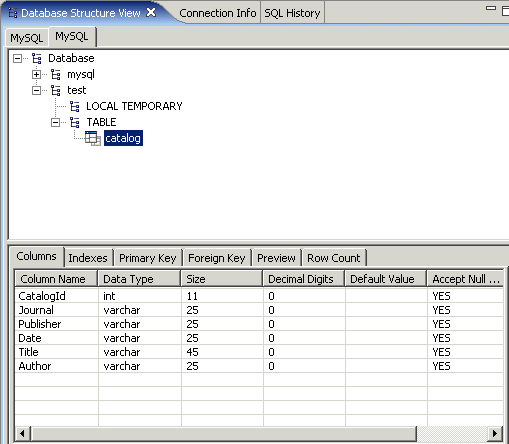 在 eclipse 的 sqlexplorer 視窗中選擇 database structure view 標簽。為了顯示表 catalog 的結構,在 database structure view 中選擇 database>test>table>catalog 結點。圖13顯示了表 catalog 的結構。