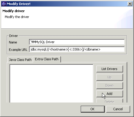 在 modify driver框中,選擇 extra class path 標簽,并且單擊 add 按扭將 mysql 驅動 .jar 文件(為下載的 connector/j 的一部分)添加到類路徑中。圖5闡明了將mysql 的 jdbc 驅動加到 eclipse 的類路徑中。
