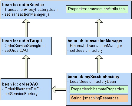 | <!-- order service --> <bean id="orderservice" class="org. springframework. transaction. interceptor. transactionproxyfactorybean"> ?。紁roperty name="transactionmanager"> ?。紃ef local="mytransactionmanager"/> </property> ?。紁roperty name="target"> ?。紃ef local="ordertarget"/> ?。?property> ?。紁roperty name="transactionattributes"> <props> ?。紁rop key="find*"> propagation_required,readonly,-orderexception ?。?prop> <prop key="save*"> propagation_required,-orderexception </prop> ?。?props> </property> </bean> <!-- order target primary business object: hibernate implementation --> <bean id="ordertarget" class="com. meagle. service. spring. orderservicespringimpl"> ?。紁roperty name="orderdao"> <ref local="orderdao"/> ?。?property> </bean> <!-- order dao object --> <bean id="orderdao" class="com. meagle. service. dao. hibernate. orderhibernatedao"> ?。紁roperty name="sessionfactory"> ?。紃ef local="mysessionfactory"/> </property> </bean> |