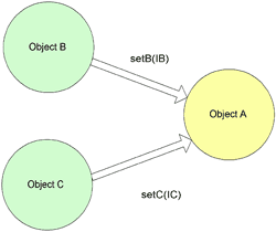 圖3:對象使用ioc組織。對象a包含setter方法,它們接受到對象b和c的接口。這也可以用對象a里的接受對象b和c的構(gòu)建器完成。