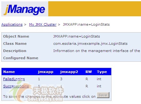 好了,我們已經完成了!從主頁上,點擊簇中的一個應用程序,然后點擊"find more objects"按鈕。你將看到name=loginstats mbean;點擊它,則你就會看到我們已經暴露的failedlogins和successlogins屬性。點擊在該同一頁面上的"cluster view"鏈接將顯示與圖5相類似的一個頁面-其中,你可以看到兩個應用程序的運行計數統計: