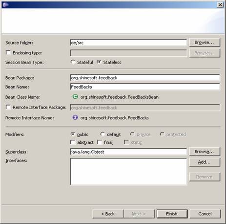 session bean type中選擇stateless,表明要創建一個無狀態會bean。在bean name中輸入要創建的session bean的名稱,這里我們創建一個處理客戶反饋的無狀態會話bean:feedbacks。點擊finish按鈕后,分別產生了會話bean的接口文件和實現文件:feedbacks,無狀態會話bean的業務接口: