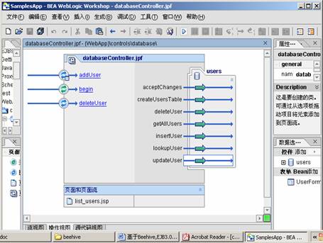由于pollinate中尚不提供控件的視圖,為了說明java control與pageflow(頁面流)之間的關系,可以參照上面這張bea workshop中java control的參考視圖,圖中的主體是一個pageflow(頁面流),而右側users就是在該頁面流中使用的一個名為users的java控件。