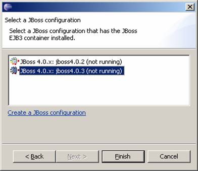 接著選擇jboss4.0.3 server作為項目默認的服務器。單擊完成按鈕,這樣就生成了一個ejb3.0的項目,其根目錄下的jndi.property文件指明了jboss服務器名稱服務的一些配置。