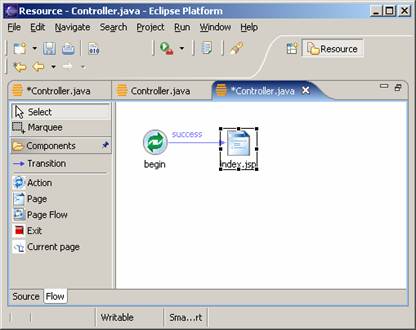 它由一個begin action和一個index.jsp頁面組成。左側是設計組件,包括action,page,添加所需的頁面和action到頁面流中。