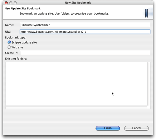還需為新的書簽指定一個名稱,“hibernate synchronizer”就很好。圖2顯示的對話框包括了我的eclipse 2.1.2環境中的所有必需信息。