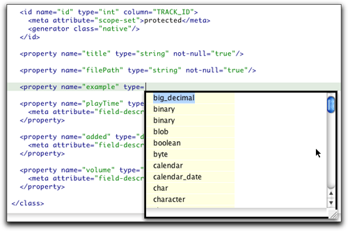 hibernate synchronizer的一個主要吸引力就在于它為映射文檔提供的專業化的編輯器。可以配置這個編輯器,以便只要保存文件就自動重新生成相關數據對象,但是這只是一個錦上添花的功能;即使不打算使用該插件的代碼生成器,您也可能希望使用這個編輯器。它為您提供映射文檔元素的智能完成功能,以及一個圖形化的大綱視圖,可以在這個視圖中操縱這些元素。