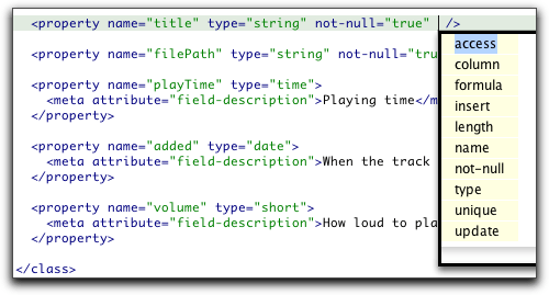 編輯器為映射文檔中添加的所有元素都提供上下文相關的自動完成支持。圖24顯示了一些例子,但是屏幕截圖無法真正捕捉到該特性的深度和有效性。我強烈建議您安裝插件并使用它。您很快就會看到它在處理映射文檔方面是多么有用。