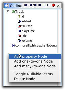 如圖26所示,大綱視圖提供了一個關于類層次結構、被映射的元素、指定查詢以及映射文檔中的各種元素的圖形化視圖,還提供一個菜單,其中有一些向導可以幫助創建新的屬性。