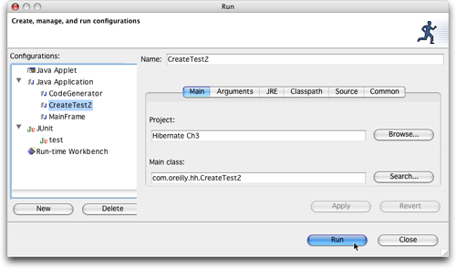 為了在eclipse中運行這個簡單的程序,我們需要設置一個新的run配置。選擇run -> run...,把createtest2.java作為當前的活動編輯器文件。單擊new,eclipse就會知道我們想要在當前項目中運行這個類,因為我們使用main()方法創建它。它指定的默認名稱是createtest2。界面應該如圖19所示。單擊run,試著創建一些數據。
