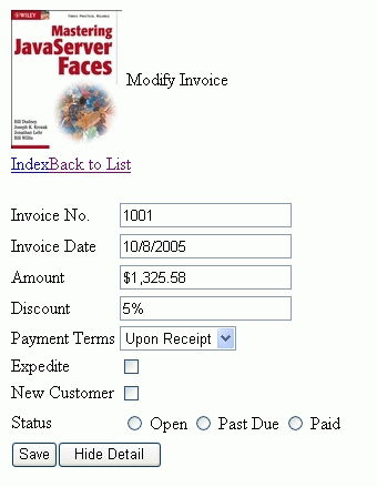 jsf中處理組件的顯示和隱藏、數據的排序等相對其它框架非常容易和直接了當, 常被教科書作為實例分析和講解。下面這個實例來自名為《 mastering javaserver faces中文版》的書(略有改動),通過組件的顯示(或隱藏)及數據的排序來講解jsf中ui組件的用法。