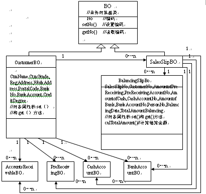 在多層結(jié)構(gòu)中,業(yè)務(wù)對象bo主要封裝了一些實體,如客戶customerbo、銷售單salesslipbo、結(jié)算單balancingslipbo、應(yīng)收款帳accountsreceivablebo、預(yù)收款帳prereceivingbo、現(xiàn)金帳cashaccountbo和銀行帳bankaccountbo等等。圖5所示為上述七個業(yè)務(wù)對象之間的關(guān)聯(lián)關(guān)系,以及部分業(yè)務(wù)對象的屬性和方法:
