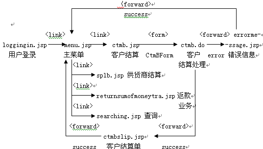 財務(wù)系統(tǒng)主要包括與結(jié)算相關(guān)的業(yè)務(wù)處理,如供貨商結(jié)算、客戶結(jié)算、返款處理、各種帳簿的查詢、科目表的維護(hù)等等。下面以客戶結(jié)算為例說明struts框架下系統(tǒng)的設(shè)計與實現(xiàn)。