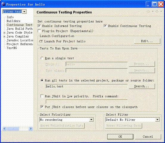 也就是說我們需要改變continuous testing查找test case的方法,使得當hello工程被修改時,continuous testing從工程hello.test中尋找測試用例。