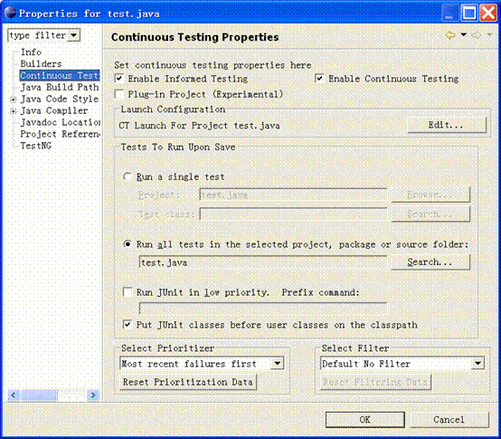在工程中啟用continuous testing 安裝了continuous testing之后,我們就可以在任何java工程中激活continuous testing了。在package views中單擊鼠標右鍵并從菜單中選擇property。在隨后出現的工程屬性對話框中,我們可以看到配置信息有了一個新的分類continuous testing。選擇這個分類,并在continuous testing properties頁面中選中"enable informed testing"和"enable continuous testing"。這樣我們就激活了continuous testing。