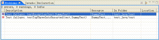 continuous testing插件在后臺執行測試代碼,當監測到有錯誤或異常發生,continuous testing將會通過problem view來通知開發人員。在我們提供的測試用例中,problem view將會如下所示: