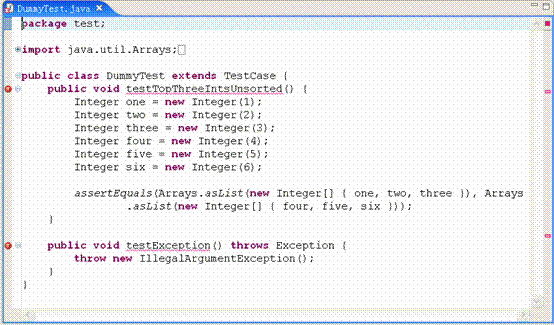 如果我們在problem view當中雙擊某一條測試錯誤信息,那么java編輯器將會打開并顯示產生錯誤的測試方法。這和我們察看其他錯誤發生地點的方式非常象,不是嗎?另外,如果我們在編輯器中打開了dummytest.java,我們還可以看到新的測試錯誤標記出現在編輯器的左側欄上。