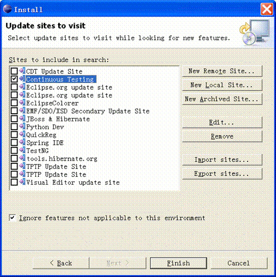 添加update site之后,在隨后出現的install對話框中選中剛剛添加的update site,并且按下finish按鈕,如圖 2所示。經過后續的下載和確認之后,我們就安裝好了continuous testing了。