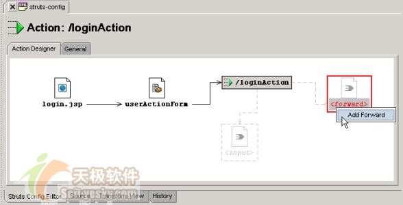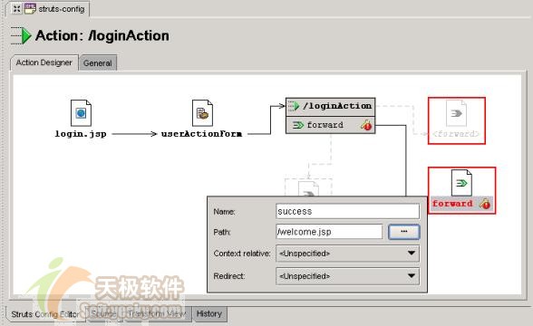 一個action一般只有一個入口,但往往會有多個出口,action根據業務處理的不同結果轉向相應的出口。圖 12 /loginaction右邊是一個帶"forward"的淺色虛框,右鍵單擊這個forward虛框,在彈出的菜單中點擊add forward菜單項,在strut config editor中將新增一個默認名為forward的出口項圖標,左鍵單擊這個forward新增的圖標,對這個出口進行制定,如圖 13所示: