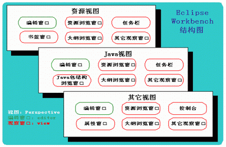 在圖二中,可以看出workbench包含多個視圖,而每個視圖又包含不同的窗口。由于每個編輯窗口有很大的共性,而且缺省情況它們都在同一區域中顯示,因此我們只在每個視圖中標出一個編輯窗口,以綠色表示。觀察窗口則各不相同,這里以紅色表示。
