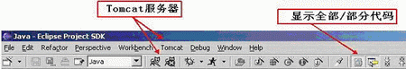 在編輯窗口,還值得注意的是,習慣了ivj的程序員在編輯java程序的時候,更愿意以方法為獨立的編輯單位(即在編輯窗口中只顯示單個的方法,而不是程序全部的源代碼),這種方式也的確是非常合理的開發方式,不僅代碼的顯示更加簡捷,還能輔助程序員編出封裝性更好的類。在eclipse在工具欄上提供了一個切換按鈕,可以在"顯示全部代碼"和"只顯示所選單元"(這里的單元指的是單個方法、變量、導入的包等)之間切換(可參考下面的圖三)。建議沒