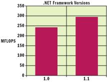 figure 1 以每秒百萬浮點(diǎn)運(yùn)算數(shù)(mflops)顯示了.net框架兩個版本的綜合得分。這給你一個大致的概念:當(dāng)前版本(1.1) 運(yùn)行得如何 以及未來版本改進(jìn)得將有多好。