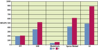 scimark 最初用 java 開發(fā)(http://math.nist.gov/scimark),后來被 chris re 和 wener vogels 移植到 c#(http://math.nist.gov/scimark)。注意這個實(shí)現(xiàn)沒有使用不安全代碼,這會使它運(yùn)行速度提高 5 至 10 個百分點(diǎn)。