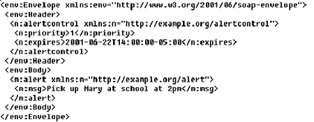 1.第一個例子闡明了soap中一個簡單的通信信息,包括了兩個不是soap定義而是應用程序定義的元素:頭塊元素alertcontrol 和體塊元素alert。頭塊元素包括兩個參數:priority 和expires。體塊元素包括的是實際傳送的信息。