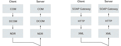 為了更好的理解soap,http,xml如何工作的,不妨先考慮一下com/dcom的運行機制,dcom處理網絡協議的低層次的細節問題,如proxy/stub間的通訊,生命周期的管理,對象的標識。在客戶端與服務器端進行交互的時候,dcom采用ndr(network data representation)作為數據表示,它是低層次的與平臺無關的數據表現形式。