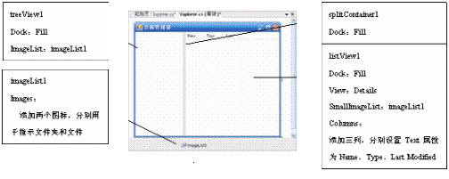 2) 向窗體中添加一個splitcontainer控件、一個imagelist控件、一個treeview控件、一個listview控件,頁面布局及各控件屬性如圖ex5-5-3所示。
