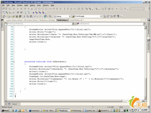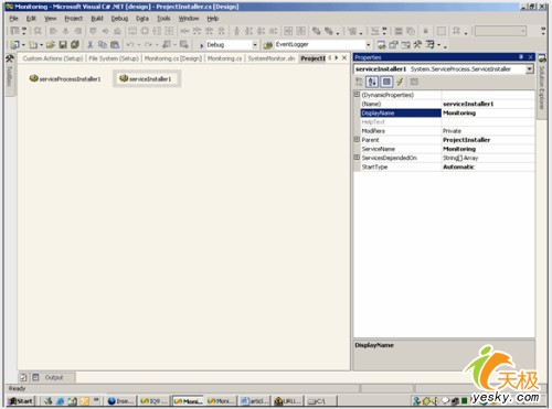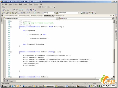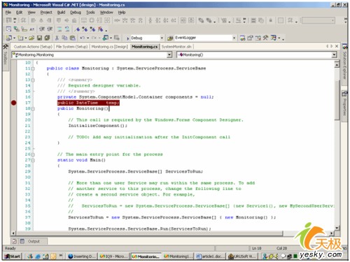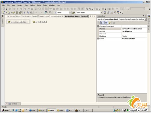 按f7鍵打開(kāi)代碼窗口。然后,加入對(duì)system.io命名空間的引用,以便把系統(tǒng)定時(shí)功能編寫(xiě)到一個(gè)文件中。下一步,用monitoring一詞替換所有出現(xiàn)的service1一詞。之后,轉(zhuǎn)入設(shè)計(jì)模式(按鍵shift+f7)。選擇solution explorer(按鍵ctrl+alt+l)。點(diǎn)擊service1.cs并且命名它為monitoring.cs。
