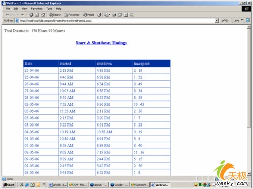 每一個(gè)人都想知道他們每天在什么時(shí)間啟動(dòng)和關(guān)閉自己的系統(tǒng),以及系統(tǒng)每天運(yùn)行了多少時(shí)間。如果用一個(gè)datagrid控件來(lái)顯示系統(tǒng)啟動(dòng)、關(guān)閉及所消耗的時(shí)間將是一個(gè)不錯(cuò)的主意。
